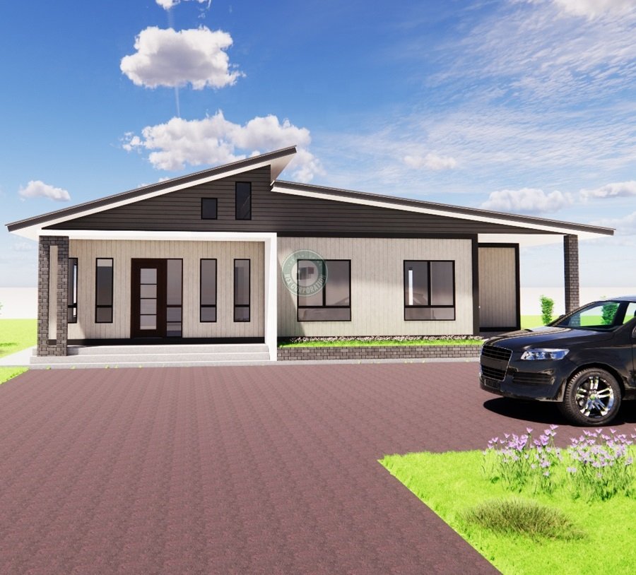 The Simon House blends brick and wood construction with a modern single-storey layout that balances functionality and style. With expansive floor-to-ceiling windows in the living and dining areas, this home brings the outdoors in, flooding the interior with natural light.
